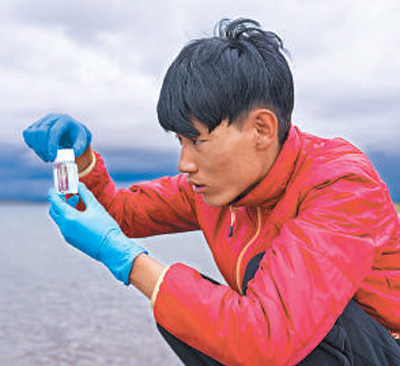 纳木错站观测主管达瓦扎西在取样。记者徐驭尧摄