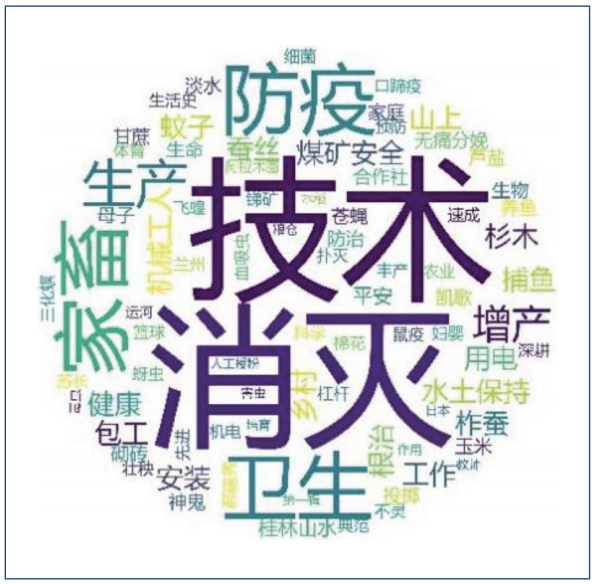 1949—1958年共有51部科教电影,系列片《消灭棉蚜虫》《消灭苍蝇》《消 灭蚊子》《消灭飞蝗》与“除四害”卫生运动密切相关。“家畜”“增产”“捕鱼”“水土保持”等农业技术词语是高频关键词,多数影片是传统的技术推广片,“看得懂、用得上、学得会”是当时衡量科教片好坏的标准。科教电影片名主题直截了当,展示出生活实用性,缺少艺术表达,科教电影建立在科学主义的意识形态背景之上,倾向把相关科学技术研究成果和知识无条件堆积在影片中,积极肯定科学技术带来的好处,推崇硬科学科普。其次是工农业技术和卫生健康等主题突出。新中国成立初期,需要大力促进生产,农村人口多,受教育水平极低, 运用影像手段来普及科学知识和技术成为主流方式之一。这一阶段的科教电影受高度一体化的计划经济影响,政治色彩浓厚。在土地改革、三大改造为标志的社会革命背景下,促进生产力发展成为科教电影的任务之一。