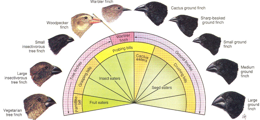 达尔文雀(图片来源:https://www.mun.ca/biology/scarr/Adaptation_in_Darwins_Finches.html)