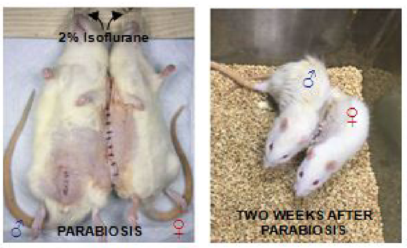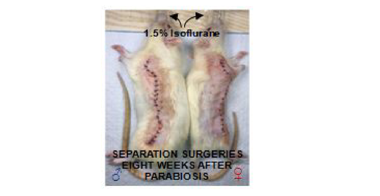 具体来说,研究者首先通过手术,将雄性大鼠(经过去势)和雌性大鼠背靠背连接成“连体鼠”,使二者可以共享血液。