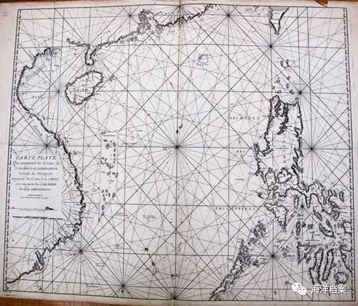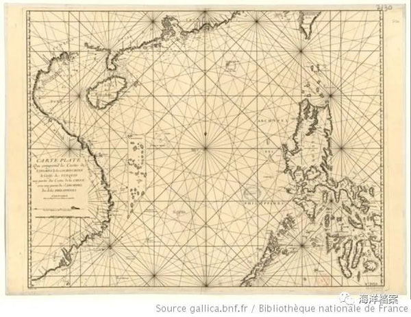 18世纪法国纪尧姆·德南(Guillaume Dheulland, 1700-1770)绘制的占婆、交趾支那、东京湾、中国和菲律宾群岛沿海图。南沙群岛的位置尚空白,表明当时法国对南沙一无所知。此图用棕色标记手工标出法国1933年占领的南沙群岛九小岛的位置,同样证明法国对九小岛的主张是站不住脚的。
