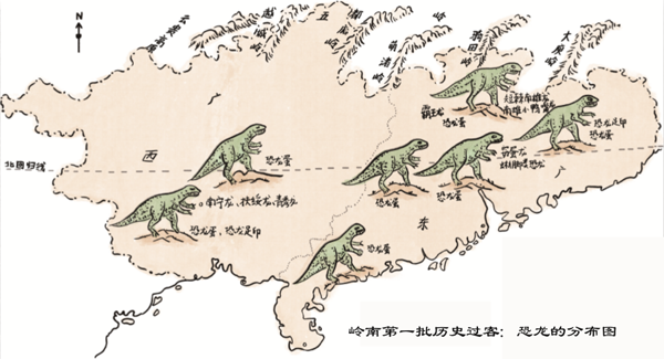 在岭南的韶关南雄、河源、三水,佛山、广州,深圳,东莞,惠州、梅州、茂名、中山、南宁、扶绥、崇左、百色、河池等广大地区都曾发现了恐龙遗骨,遗物及遗迹。