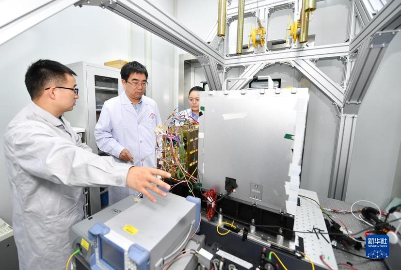 2月8日,中国科学院国家授时中心首席科学家张首刚(中)在空间窄线宽激光实验室与科研团队成员交流。新华社记者 张博文 摄