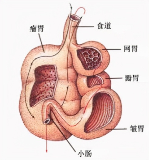 最后才来到了皱胃,而皱胃,更像我们人类的胃,消化液分泌后会进入皱胃,消化后到达肠道,因此也被称为“真胃”。