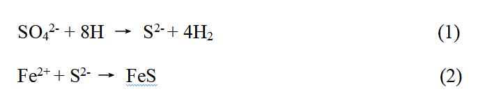 科学家研究表明微生物参与腐蚀过程,金属表面会附着一层具有腐蚀能力的生物膜,在微生物体内生物酶的作用下,细菌将硫酸盐还原成硫离子,硫离子与腐蚀产生的铁离子进一步反应生成铁硫化物(反应1和2),从而参与并加速腐蚀过程。
