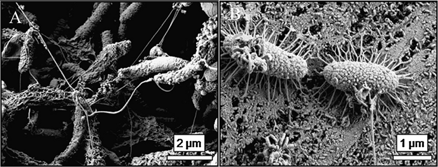 扫描电镜下观察到的钢材上附着的微生物(图片来源:参考文献3)