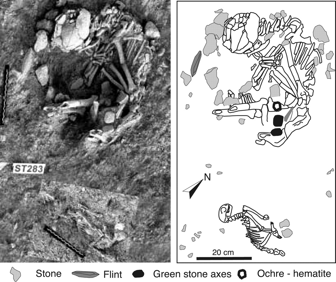 研究人员发现了一个人类的坟墓,遗骨的附近有一个小坑,埋着24个完整的贝壳,以及其他一些石器和陪葬品,这意味着这位死者享有一定的社会地位。