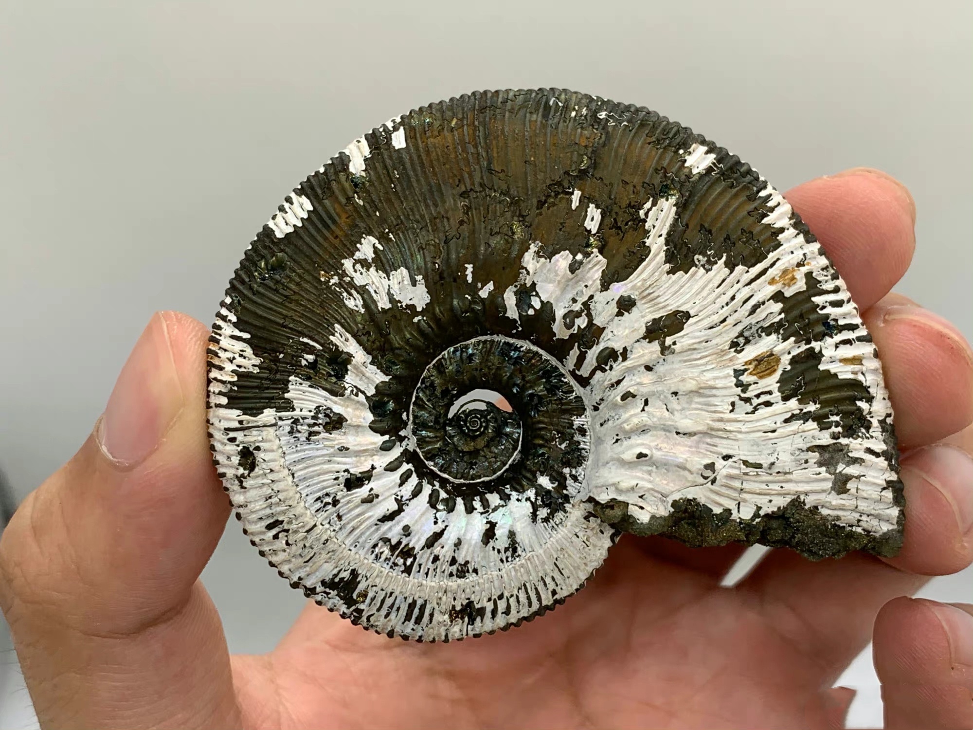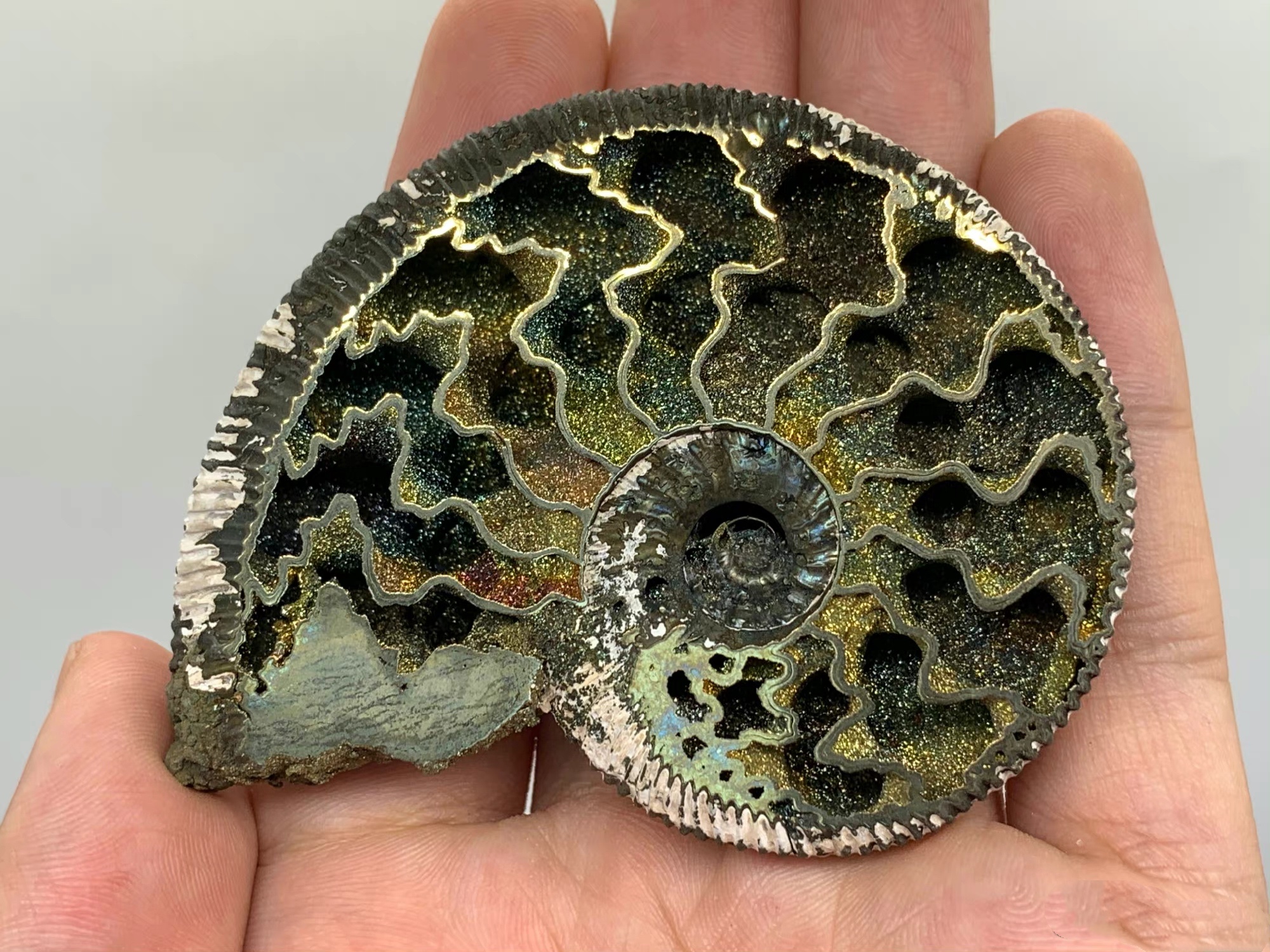本块菊石化石,来自俄罗斯中侏罗纪时期🦕的菊石,这块菊石非常特别,内部住室结构完整中空未被填充,整体被黄铁矿化完全交代,并且伴有美丽的🌈锖色,从不同的角度看可以呈现不同的颜色。