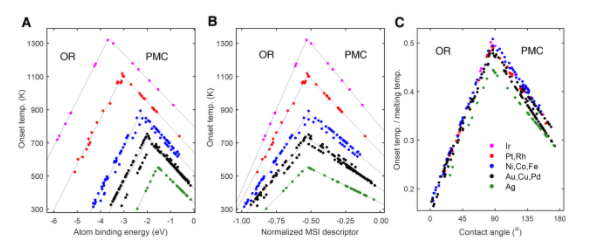 该团队结合研究了323种单组分载体负载的纳米催化剂生长速率和金属与载体界面作用强度之间的关系,揭示存在有一般性的火山型依赖关系。