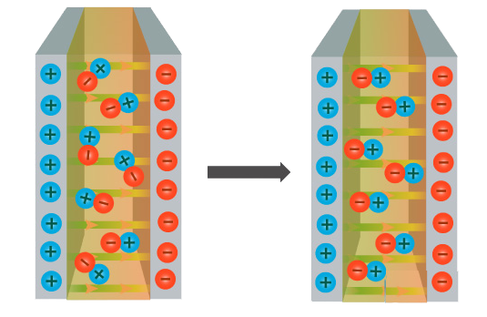 电介质是如何增加电容器的电容量的?电介质包含极性分子,这意味着它们可以根据两个板上的电荷改变方向。因此,分子以这样一种方式与电场对齐,使更多的电子被吸引到负极板,同时将更多的电子排斥出正极板。