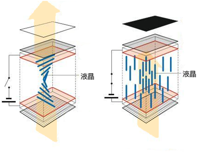 不加电压时,光线通过第一个偏光片后,它穿过玻璃板并在穿过时旋转90 度,以匹配液晶排列。这允许光线穿过第二个偏振片,从而照亮显示器。 当加电压时,液晶分子的方向不同,都指向偏光片,但不再旋转90度。偏振光无法通过第二个偏振片,使显示器保持黑色。