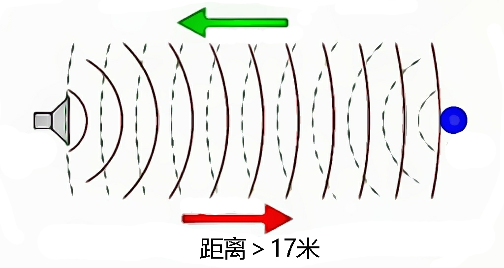 所以,根据声音的传播速度,产生回声的源和反射物体之间的最小距离应为17m。差异必须大于大约100毫秒才能被感知为回声。