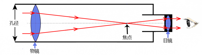 前端有一个弯曲的物镜,物镜是凸透镜。入射光经这个透镜后会聚在焦点处,然后光线再次分开。另一个凸透镜即目镜接收会聚光并将其拉直,放大焦点处的图像并将其聚焦。因此,折射镜必须有一条长而清晰的路径,以允许光线弯曲。它的图像是倒置的。