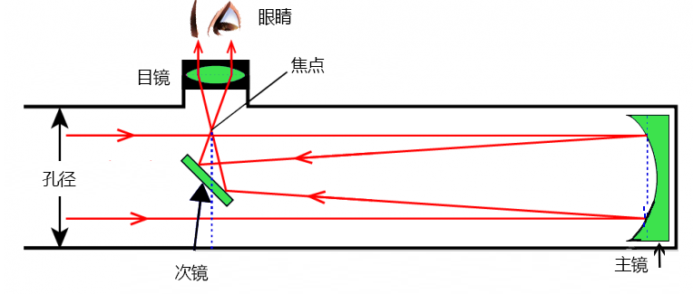 有时也被称为牛顿望远镜,以纪念它的发明者牛顿(Newton),他于 1668 年建造了第一台望远镜。在反射镜中,光线在主镜对面的一端进入望远镜。镜子是凹面镜,将光会聚在另外一个镜子上。目镜中的凸透镜接收会聚光并将其拉直。与折射镜一样,图像仍然是颠倒的。它在人的视线方向上表现为望远镜之外的虚像。