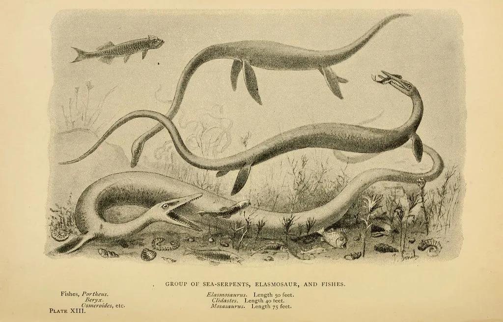 薄片龙与沧龙类的硬椎龙Clidastes、沧龙Mosasaurus,早期的复原图画成了非常“曲线美”的形状 | Biodiversity Heritage Library