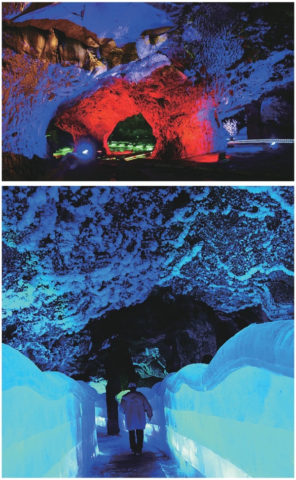 刚到洞口,就感觉到洞内传出的阵阵寒意。洞内的冰据说已有1万多年了。租了棉衣步入洞中,一个冰封霜染的银色世界展现在眼前。洞内外近40℃的温差,进入洞内顿时感到寒气袭人、暑气顿消。想进了第一道门,沿着斜斜的狭窄台阶下去,不远处设有第二道门,再往里还有第三道门。这些门都很狭窄,遮挡得也很严,据说是用来保温的,怕洞里进了太多热气。过了第三道门,眼前豁然开朗,一个空间很大的溶洞呈现在眼前,与此同时,一股寒气也袭了过来。为方便游客在洞内行走,洞中修建了木栈道。栈道四周筑了不少晶莹剔透的冰墙,洞内还有很多冰雕,虽然赶不上哈尔滨的冰雕壮观,却也绚丽多姿,在变换的彩色灯光里显露出迷幻的景象。栈道并不是修建在岩石上的,而是建在巨大的冰层上;冰层深处有十几米甚至几十米,化了就是一道深渊。此时,人们就像站在将要雪崩的山崖上,既恐惧,又刺激。