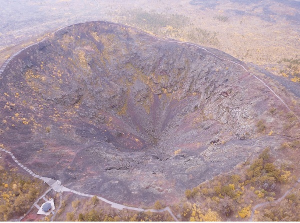 尽管老黑山海拔515.9米,实际上,它仅高出地面165.9米;所以,人们往往是在不知不觉间就爬到了山顶。猛然间,一个巨大的漏斗状火山口呈现在眼前。一块火山岩上书有4个红漆大字—山巅火口。火山口直径达350米,深140米,绕着火山口走一圈,周长有3000多米。靠近火山口,探头望去,里面是一片烧焦的碎屑浮石,在重力的作用下,滑落成一个约30°角的圆形深坑。坑内四壁陡峭,干涸无水,寸草不生,里面的熔岩碎屑并没有被风化掉。在这个浮石的世界里,无数紫红色和褐黑色的熔岩碎块,把火山口渲染成砖红色,犹如一口刚刚熄了炉火的锅灶一样。遥想当年,那是怎样一幅激动人心、宏伟壮观的画面:地下的岩浆带着巨大的能量从火山口喷出,形成方圆1200平方千米的熔岩台地。在震耳欲聋的刹那间,地动山摇,到处是一片火海,硫磺、二氧化碳、硫化氢和二氧化硫等气体伴随着水汽裹挟着灼热的液态熔岩冲向九霄,接着散落下来成为火山弹、火山渣、火山砾和火山灰……