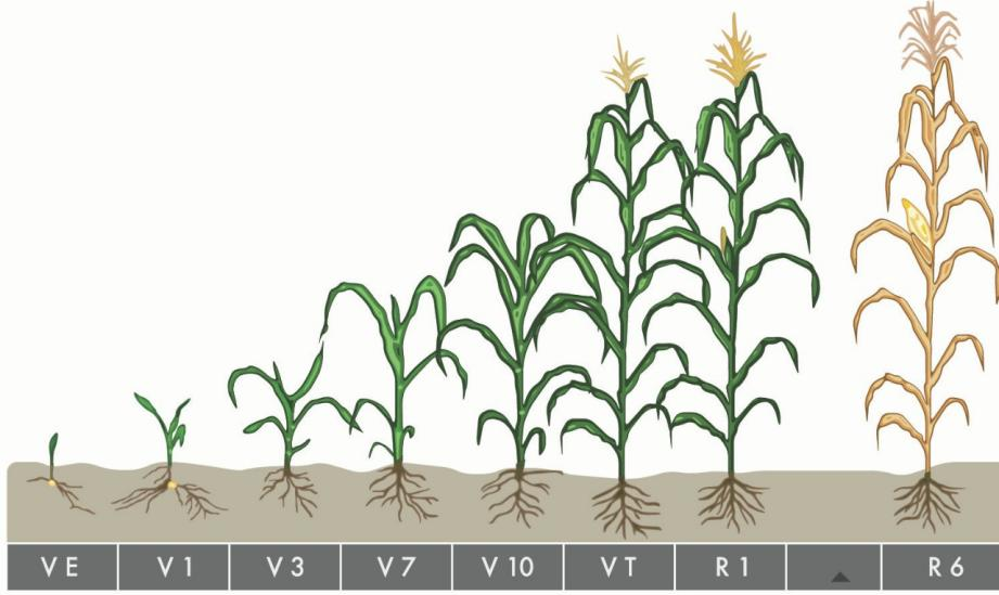 图示玉米的两种生长阶段:VE-V10,营养生长;VT-R6,生殖生长。不同植物有着不同的转换生长模式的机制