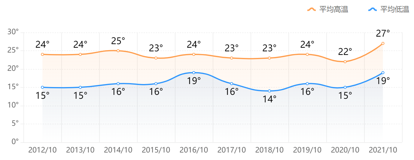 杭州10月平均温度历年数据图,可见今年杭州的秋天格外热,降温晚