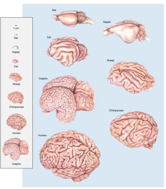 不同哺乳动物的脑对比(图片来源Neuroscience: Exploring the Brain(2007)-Chapter7)
