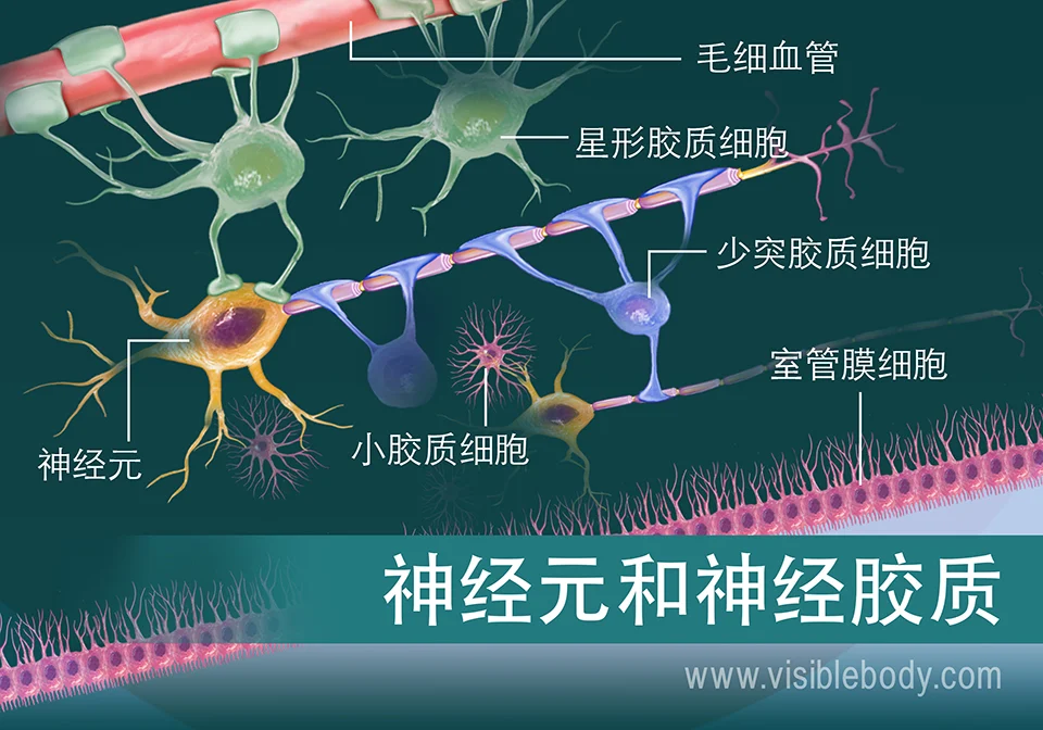 神经胶质细胞保护,供养和支持神经元(图片来源:www.visiblebody.com)