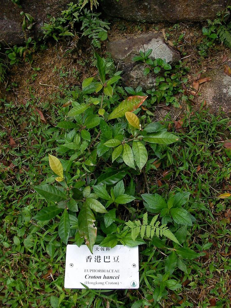 关于香港巴豆,还有一段曲折的故事。1850年,汉斯在香港岛(具体地点不详)采集到一种植物标本,到了1861年,英国植物分类学家乔治•边林(George Bentham)在《香港植物志》中首次将其正式发表,模式标本保存在哈佛大学。从此Croton hancei有了真正的姓名,后来《拉汉种子植物名称》将其中文名拟作“香港巴豆”。