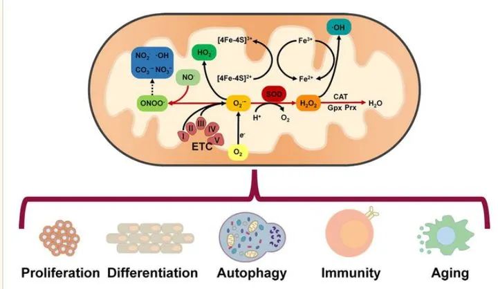 而在这个过程,线粒体会一直进行氧化磷酸化,这个过程就有大量的氧自由基。绝大多数情况下,这些氧自由基是在电子传递链中进行反应,但是总有一些氧自由基会逸散,这一逸散,可就麻烦了。