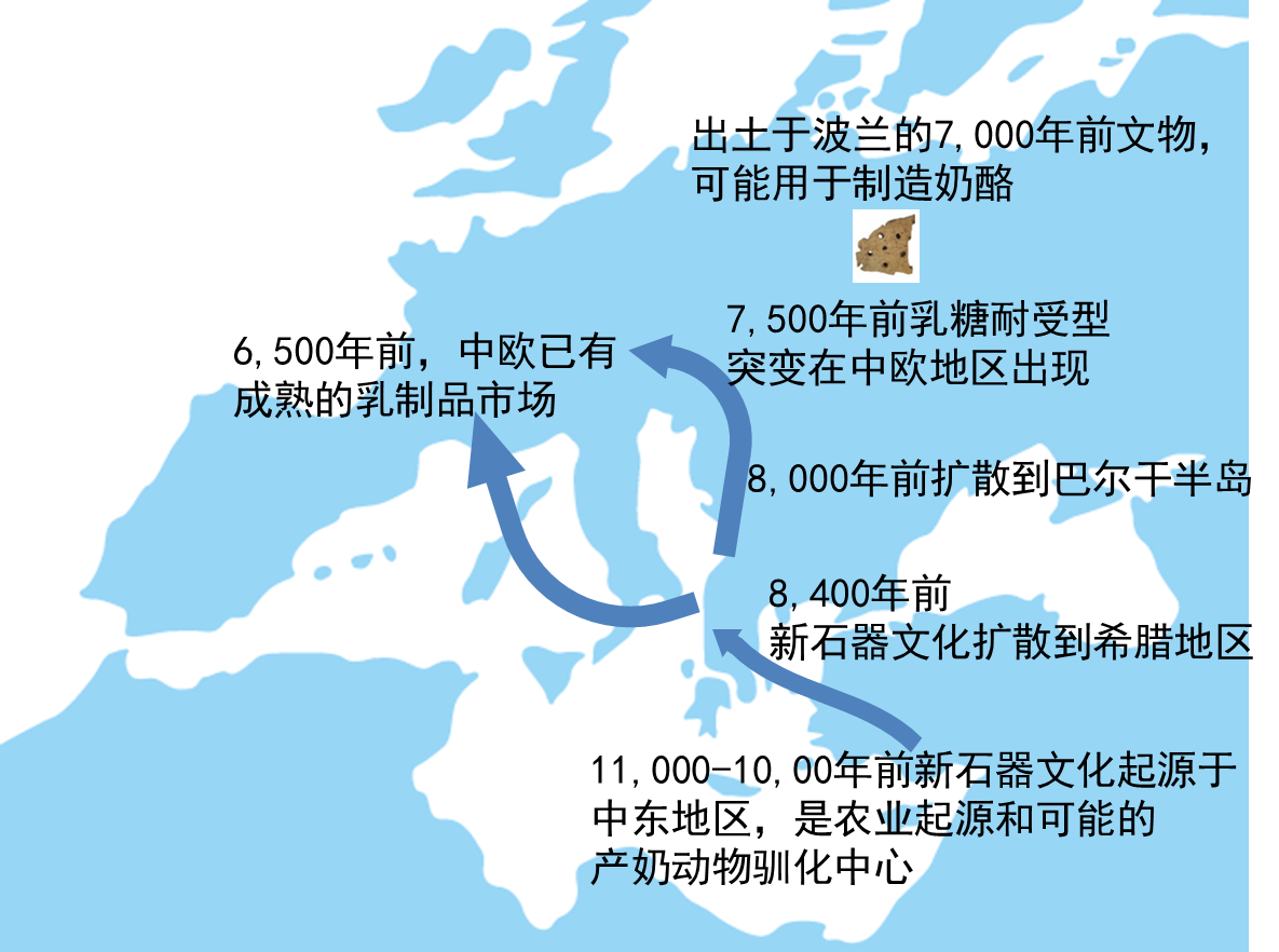 然而,家牛刚被驯化或者刚扩散到欧洲时,当地成年人并不能直接喝大量牛奶,因为这可能引起乳糖不耐受症。