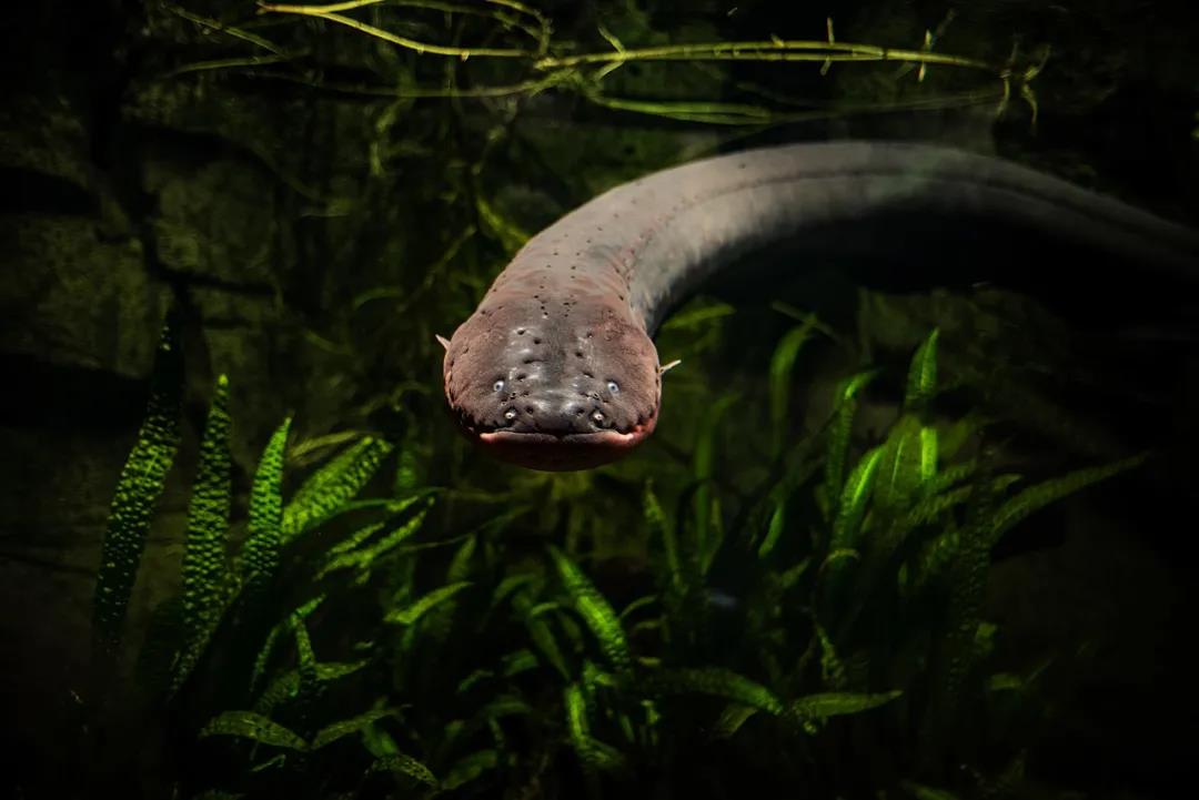 电鳗喜欢生活在水比较浅的池塘或河流岸边,这种水环境中往往泥沙等杂质比较多,导致水体非常浑浊,能见度较差。所以电鳗的眼睛也就“聊胜于无”,变得非常细小。不过在它的眼睛下方口裂两侧,分布着一些凹陷的“小洞”,这些小洞可以感受到水流变化和周围细微震动,一定程度上弥补了视力的不足。