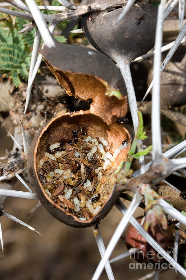 镰荚金合欢本来在每对由刺保护的节间,都会生成密集的芽,但它们的芽一旦长出来,蚂蚁就会迅速地在上面聚集,将大多数芽全部毁灭,断了镰荚金合欢向上方、向四周扩张的可能。最终,镰荚金合欢得以保留的,只有在蚂蚁巢穴旁边的芽了。