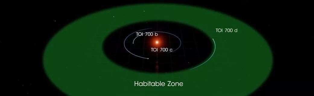 TOI 700d比地球大20%左右,公转周期为37天,距离地球100光年,是围绕一颗M型红矮星TOI 700运转的3颗行星中最靠外的一颗,它从母恒星获得的能量约为地球所接收的太阳能的86%,刚好能在恒星的宜居带中维持液态水的存在。另外,对TOI 700近1年的监测未发现可探测的恒星耀斑活动,大大提升了TOI 700d的宜居性。