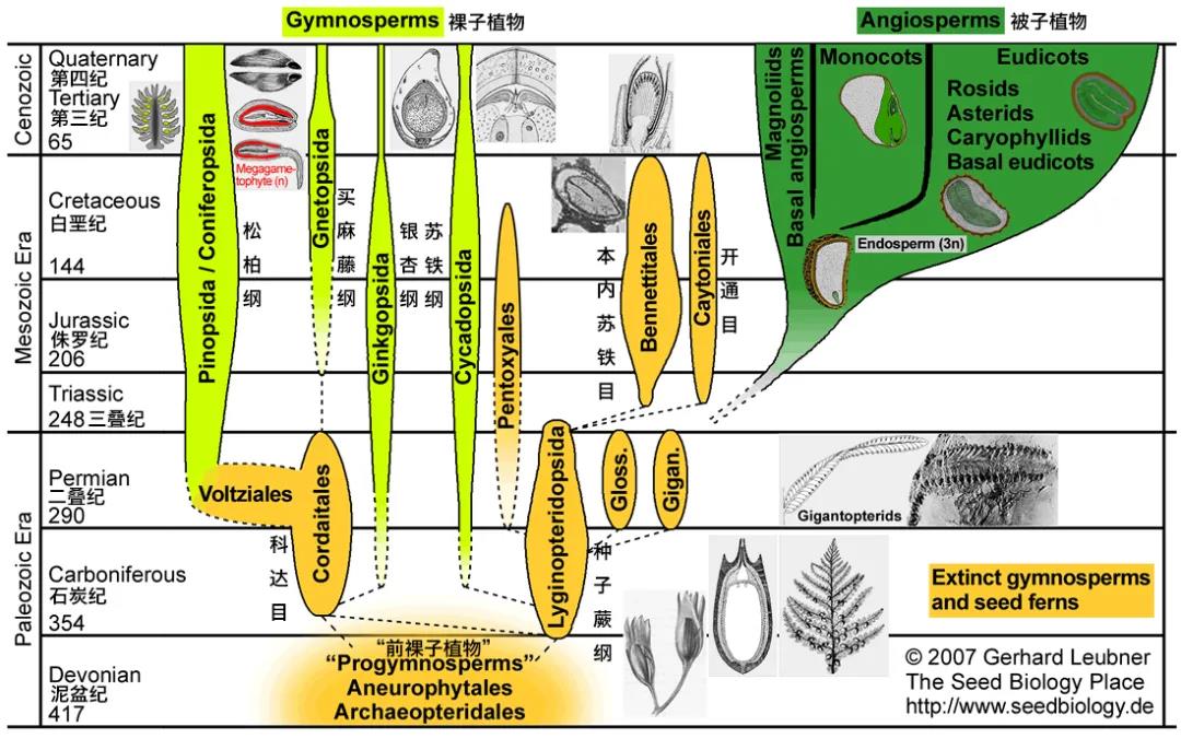 现生裸子植物总的来说就是一副劫后余生的样子:种类很少、不同的分支之间差异巨大、没有过渡形态 | Gerhard Leubner / The Seed Biology (2007)