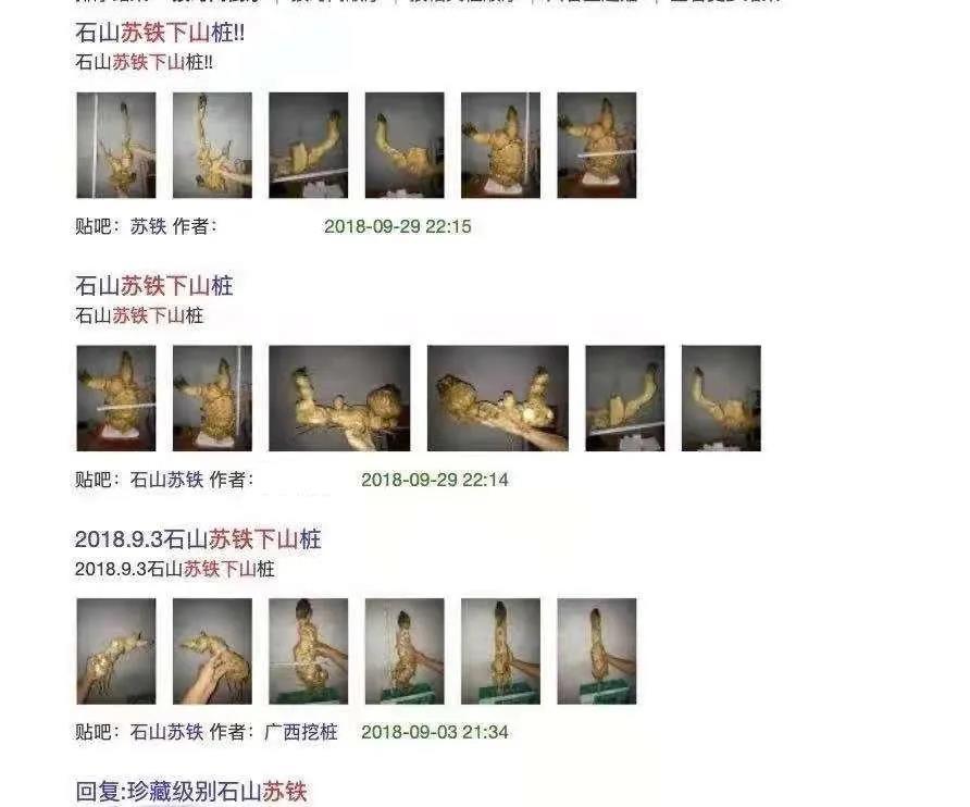 但是野生苏铁的处境不仅没有因此好转,近几年反而越来越糟。其中一个重要原因,是电商平台、社交媒体和互联网社群让非法交易更加便捷、隐蔽而难以监管。就在此刻,淘〇、〇鱼、拼〇〇都有大量疑似野生苏铁在售,而最猖獗的是百〇〇吧,“石山苏铁下山桩”、“97斤德保苏铁”就明目张胆写在帖子里。这还只是能看见的部分,在各种聊天群里私下交易的可能更多。