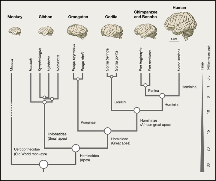 不过,大部分灵长类动物说实在的,在身体素质上和人类相比,差远了。我们实验室里养的猴子,撑死也就是一个几岁小孩子大小,人类一巴掌都能拍的它动不了。而从脑容量上,人简直是一路狂飙[1]