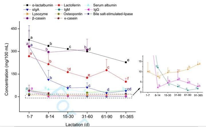 如下图所示,母乳中多种生物活性物质含量随着时间逐步变化。