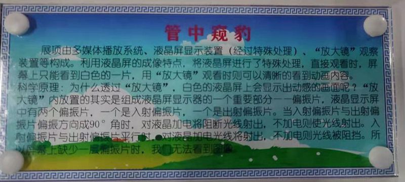 管中窥豹由由背光灯、下偏光片、液晶、上偏光片4部分组成,背光灯发出光线,光线经过下偏光片、液晶和上偏光片后呈现画面。管中窥豹将上偏光片做成了“窥视镜”,屏幕内只保留了背光灯、下偏光片和液晶3个部分。肉眼平视便空无一物,透过“窥视镜”观察则出现图像。旋转“窥视镜”,上、下偏光片的相对角度发生改变,透过的光线也随之改变,导致图像颜色改变。由此形成了管中窥豹,可见一斑。