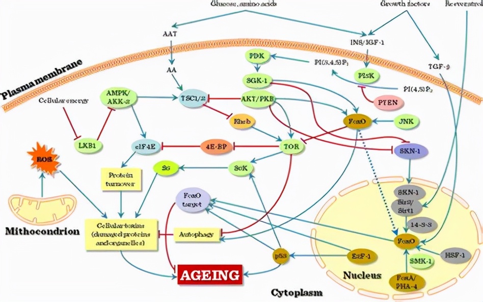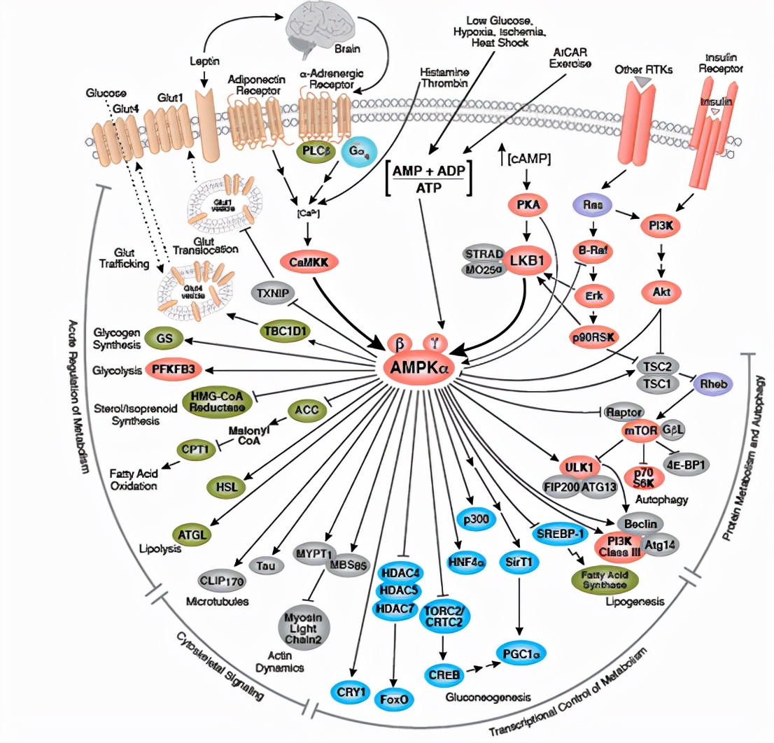 我们可以看到,AMPK基因本身和诸多生物学过程有关,比如Sirt1基因,就是非常知名的衰老相关基因,ras基因是一个在传递细胞生长分化信号方面起重要作用的基因,而AMPK可以直接影响到它的发挥,再比如mTOR公路、PI3K-Akt通路一样如此。正因为如此,AMPK可以认为是一个衰老开关基因,可以通过影响它来进而让它将影响传递到更多的通路上去,从而实现了全方位的影响。