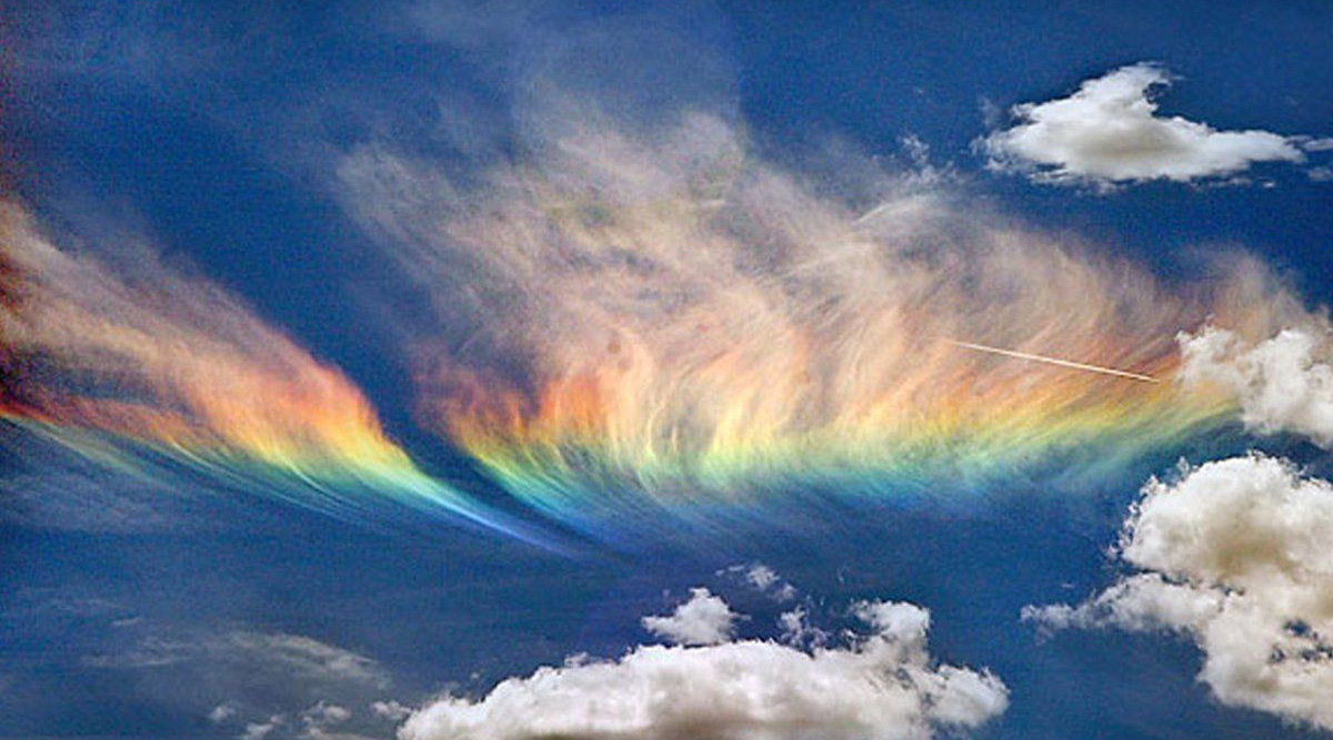 当太阳光从大气中的冰晶上方进入冰晶,就会在折射作用下将不同颜色的光分离开来,于是“七彩祥云”就出现了。如果太阳光从大气中的冰晶下方进入冰晶,那么则会形成另外一种天象,那就是“环天顶弧”,也就是我们常说的“倒彩虹”。与“七彩祥云”相比,倒彩虹的出现概率要高得多,所以很多人都曾经亲眼见到过。