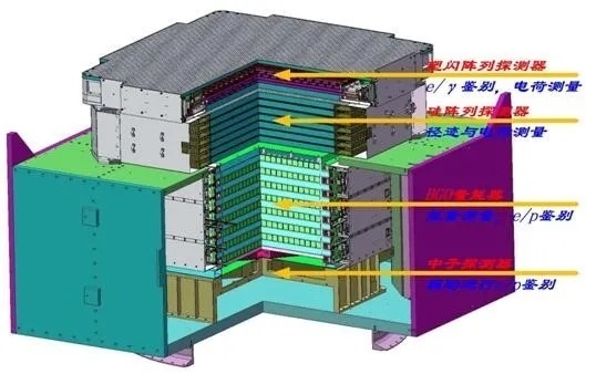 “悟空”的有效载荷由4个子探测器(塑闪阵列探测器PSD、硅阵列探测器STK、BGO量能器、中子探测器NUD)构成。其中,塑闪阵列探测器主要用于测量入射粒子的电荷,并用于伽马射线的反符合探测;硅阵列探测器主要用于测量入射粒子的方向,内部装有钨板将伽马射线转换为正负电子从而实现对其方向的精确测量,同时也可以对入射粒子的电荷进行测量;BGO量能器主要用于测量宇宙线粒子尤其是高能电子和伽马射线的能量,同时进行粒子鉴别,剔除高能核素(包括质子和重核)本底;中子探测器用于测量宇宙线中的强子与中子探测器上层的物质发生作用产生的次级中子,进一步剔除高能核素本底。