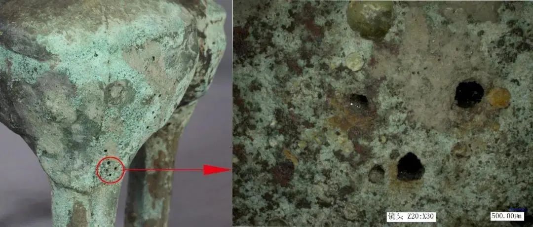 图3 青铜甗(yǎn)的锈蚀孔洞(图片来源:湖南省博物馆 苏荣誉、关晓武、孙烈、吴世磊摄)