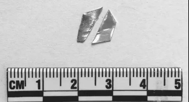 用金相显微镜和电子显微镜观察薄片的截面,发现锈蚀层极薄,只有20~50μm,绝大部分金属未被腐蚀(图17)。去除表面灰黑色的氧化层后,银白色的金属光泽又见天日(图18)。它们纤薄,展性良好,莫氏硬度在1-3之间,材料性能基本如初,真是历久弥新。历经数千年而不朽的现象,真值得好好研究一番。