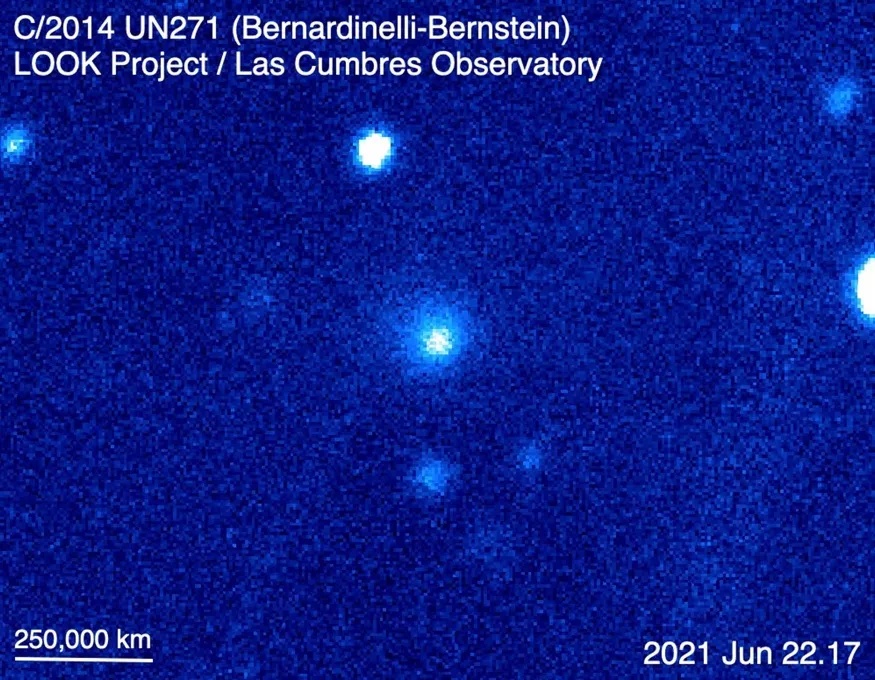 在2014年被首次观测到时,C/2014 UN271距离太阳约29 AU(天文单位,1AU约为1.5亿千米),与海王星到太阳的距离接近,所以它也是目前发现距离最远的彗星。之所以在那么遥远的地方就能被观测到,与它硕大的体型和可能的活动性使其亮度增加都脱不开干系。