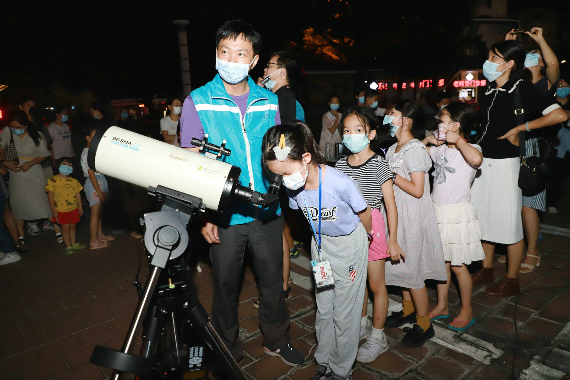 ▲孩子们通过天文望远镜亲眼看看土星和木星的样子并跟随科学馆老师指引一起认识星空。