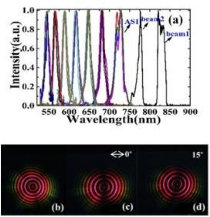 该方法也可用于产生其他偏振态和其他光谱范围的矢量光束,这将有利于多色超快矢量光束的进一步产生和应用。而且这项工作得到了国家自然科学基金、仪器研制项目和中科院战略重点研究计划的资助。研究首次利用级联四波混频(CFWM)在两个强矢量飞秒脉冲泵浦的玻璃板中,简单地产生了新颖的多色同心环形超快矢量光束(MUCAU-VB)。原理验证实验表明,基于级联四波混频工艺同时获得: