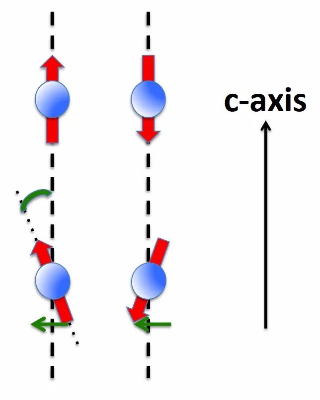 图示:反铁磁(上)和反铁磁倾斜(下),在后一种情况下,自旋相对于易c轴倾斜,导致在垂直于该轴的平面中由铁磁贡献(由绿色箭头表示)。