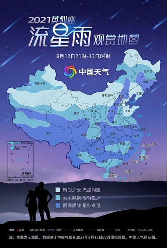最近我国大部的天气不冷不热,早晚比较凉爽,非常适合晚间在户外进行观测。我国各地具体观赏天气如何?中国天气网气象分析师王伟跃介绍,从气象条件来看,8月12日21时至8月13日4时,黑龙江北部、内蒙古大部、辽宁、山东中北部、新疆东部以及南疆盆地等地云量较少,天空比较晴朗,适宜赏景和拍照;大城市中,尤其呼和浩特,有望拍出流星闪耀夜空的大片。