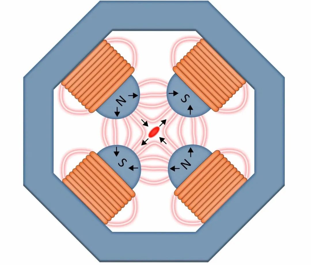 (上图所示)四极磁体,在粒子加速器中,如果粒子偏离集中束太远,极就会将粒子推到一起。四极聚焦只在一个平面上,所以为了从两侧挤压加速器光束,这些磁铁通常是一个接一个地堆叠起来,每个磁铁都相对于前一个旋转90度。通过这种方式,束流粒子在穿过连续的磁铁时会在两个方向上被推到一起。图片:Jerald Pinson