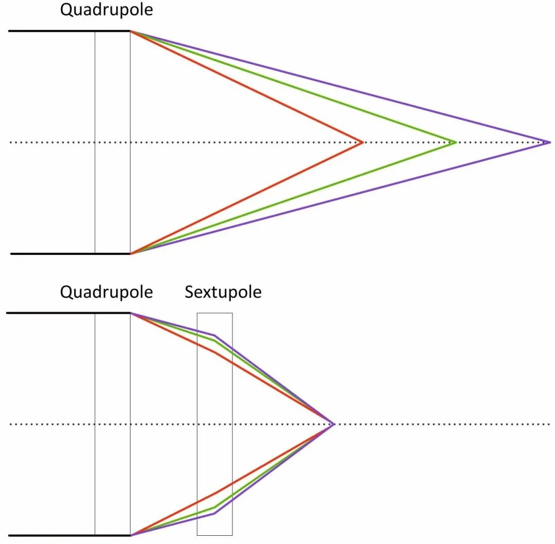 就像偶极磁铁可以使光束弯曲但不能保持聚焦一样,四极磁铁可以使粒子聚焦,但不是全部聚焦到同一位置,因为构成光束的粒子的能量略有不同。不幸的是,对于所有的光束能量,四极磁体的行为并不完全相同,与低能粒子相比,高能粒子受四极磁场的影响较小。结果是高能粒子和低能粒子沿着光束路径聚焦在不同的点上,这类似于水滴弯曲不同颜色的光以产生令人惊叹的彩虹方式。