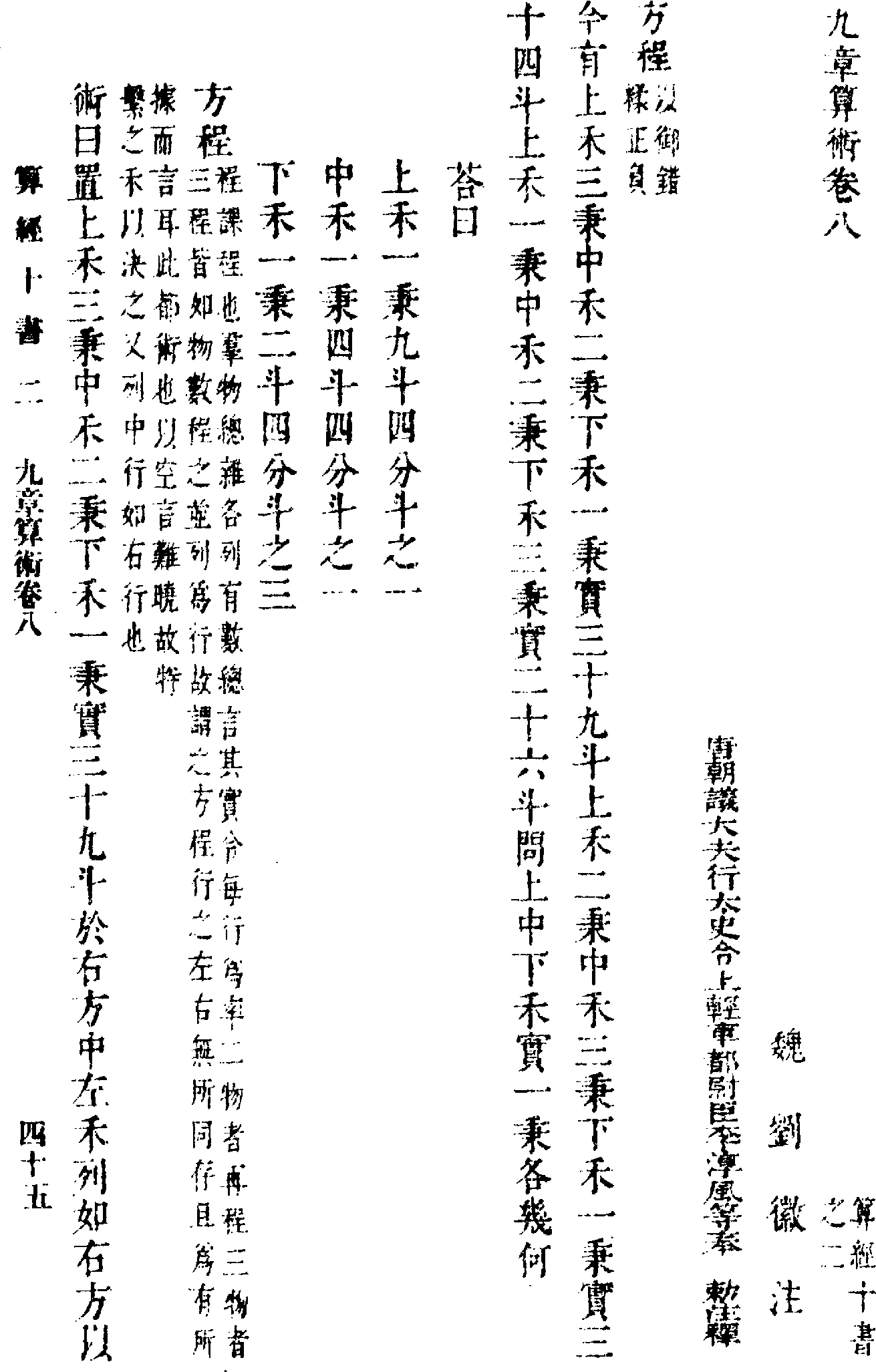 汉朝还没有小数,汉朝数学家只能用分数来表示小数。在《九章算术》里, 这道题的答案是“上禾一秉,九斗四分斗之一;中禾一秉,四斗四分斗之一;下禾一秉,二斗四分斗之三”。用现代话讲,优质稻子每捆碾米九又四分之一斗, 普通稻子每捆碾米四又四分之一斗,劣质稻子每捆碾米二又四分之三斗。