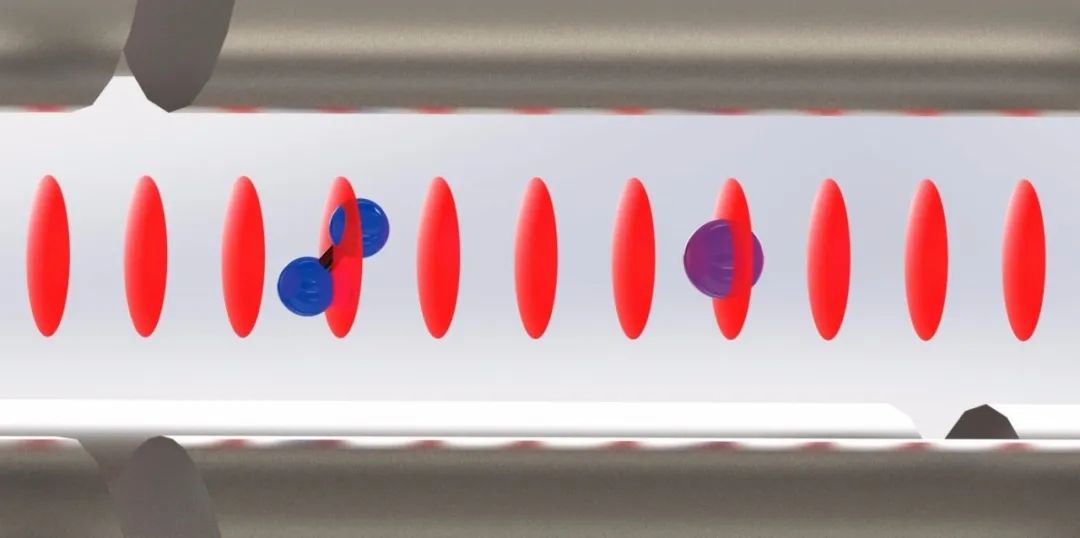 (上图所示)一个带电的氮分子和光学晶格中一个带电的钙原子。图片:University of Basel, Department of Chemistry